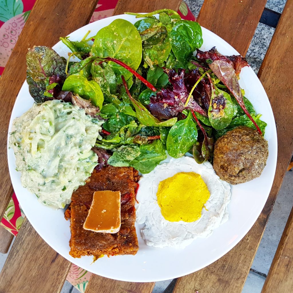 Till lunch serverar vi en mix av fyra olika rätter med en sås, allt helt glutenfritt. Meny ändras efter säsong och vecka. Lunchen serveras under hela dagen.